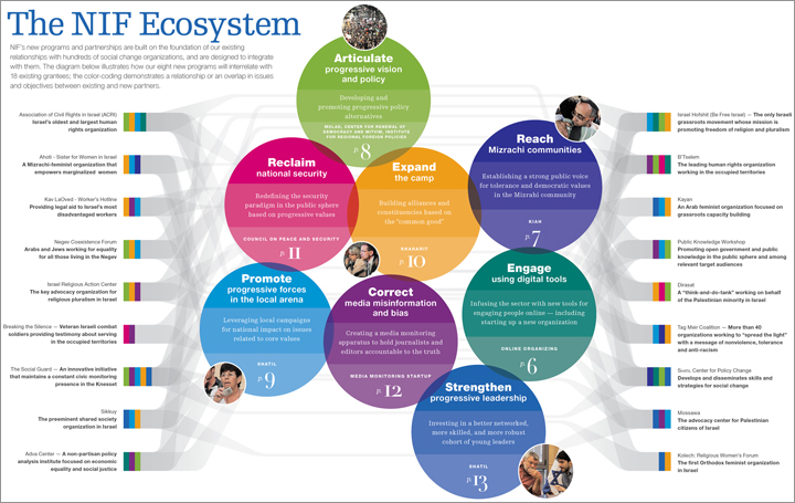 NIF’s new programs and partnerships are built on the foundation of our existing relationships with hundreds of social change organizations, and are designed to integrate with them. The diagram below illustrates how our eight new programs will interrelate with 18 existing grantees.